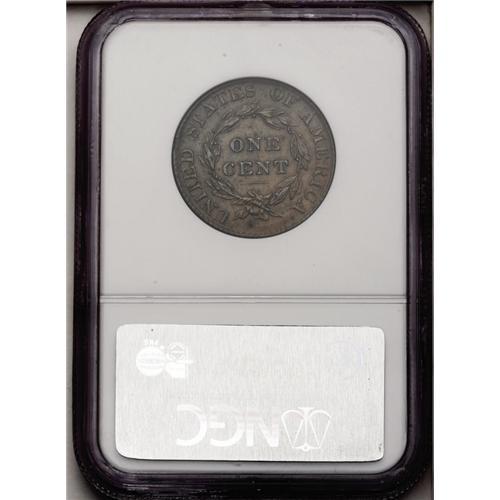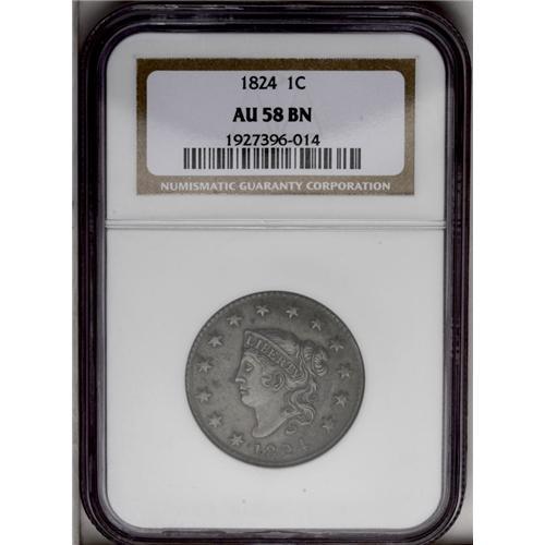 <B>1824<1C> AU58 NGC.</B></I> N-2, R.1. Intermediate die state with obverse die crack from the crossbar of the 4 in the date to star 11. The major devices are typically sharp with lighter steel-brown color interrupted by patchy areas of roughness on the obverse. EAC 45.
