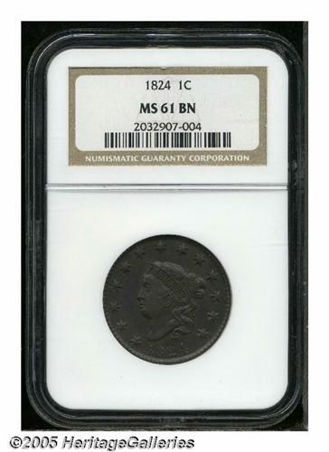<B>1824<1C> MS61 Brown NGC.</B></I> N-4, High R.2. A late die stage of this lovely and smooth ebony-brown Mature Head Cent. The major devices are well struck; most of the stars are flat. Void of relevant marks or verdigris.