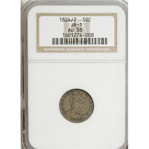<B>1824/2 10C AU58 NGC.</B></I> JR-1, R.3. The sole collectible variety of the date, since JR-2 is represented by only a handful of pieces. All 1824 dimes are overdates, since one obverse die was used. Little attempt was made at the mint to efface the underdigit 2, since its knob, peak, and curve are readily evident. Gold-brown and blue toning bathe each side of this lightly circulated dime. A toned-over inoffensive pinscratch is visible in Liberty's hair.<BR><BR><B>Coin Engraver:</B> John Reich<BR><BR><b>Shipping:</b> Coins & Currency (<a target="_blank" href="http://www.heritageauctions.com/common/shipping.php">view shipping information</a>)
