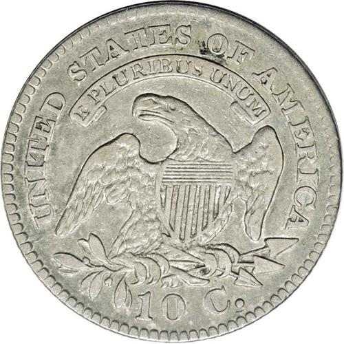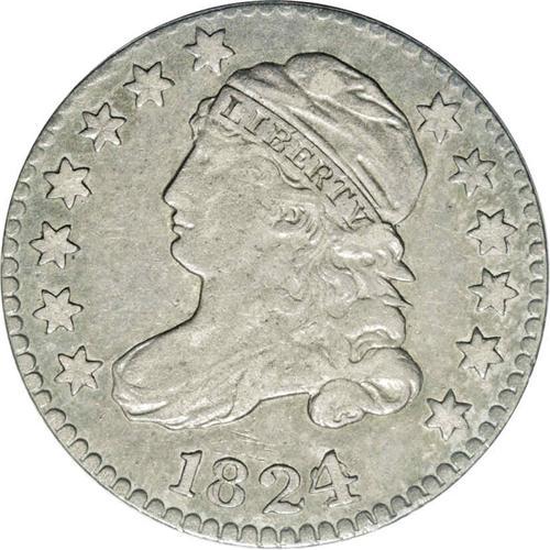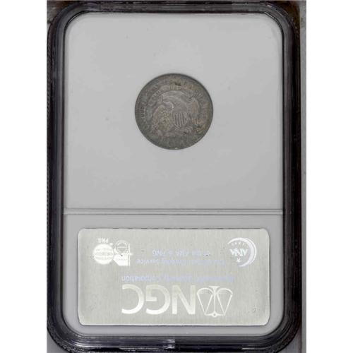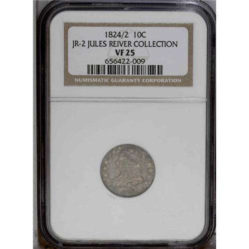 <B>1824/2<10C> JR-2, R.5. Reiver state a. VF25 NGC.</B></I> A very attractive coin for the grade with dark blue and gold toning over the usual gray hues. The strike is sharp for this issue, although the curls on Liberty are a bit weak. Excellent surfaces for the grade, with no distractions. Identifiable by a complex nick to the right of the eagle's neck and below the UM in the scroll, and there are two dark specks, one adhering to the O in OF, the other in the right claw of the eagle.<BR> This variety was discovered by H. Rolland Willasch just prior to the publication of <I>Early United States Dimes 1796 -1837</B></I> but in time to be included in the book. Considered extremely rare after the initial search through the known variety collections, the intervening two decades have discovered quite a few specimens reducing this to an R.5. The overdate feature is clear to the eye, and the top of the 1 in the denomination is curved as opposed to flat on the other 1824 dime variety. The 1822 obverse die was not used in 1822, but apparently leftover and then overdated in 1824 and used to coin both known varieties of 1824 dimes.<BR><I>Ex: Bill Conroy (May 1986).</B></I> Envelope Included.