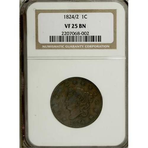 <B>1824/2 1C VF25 NGC.</B></I> NGC Census: (2/18). PCGS Population (3/20). Mintage: 1,262,000. Numismedia Wsl. Price for NGC/PCGS coin in VF25: $358. (#1639)<BR><BR><B>Coin Engraver:</B> Robert Scot or John Reich<BR><BR><b>Shipping:</b> Coins & Currency (<a target="_blank" href="http://www.heritageauctions.com/common/shipping.php">view shipping information</a>)