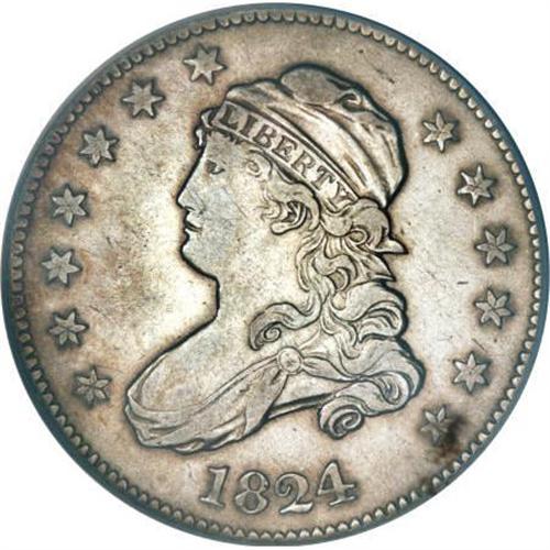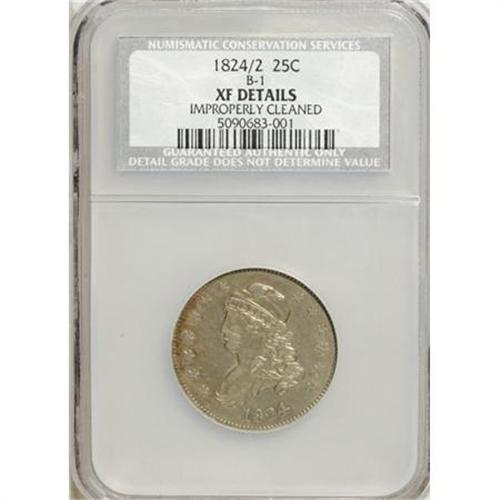 <B>1824/2 25C --Improperly Cleaned--NCS. XF40 Details.</B></I> B-1, R.3, the only dies. Although unusually bright from the cleaning, this remains an attractive coin, highly collectible because of this date's scarcity. Light wear is visible on the highest points of the coin, most notably on Liberty's hair. The mostly steel-gray surfaces are lightly abraded for the circulated grade.<BR><BR><B>Coin Engraver:</B> John Reich<BR><BR><b>Shipping:</b> Coins & Currency (<a target="_blank" href="http://www.heritageauctions.com/common/shipping.php">view shipping information</a>)