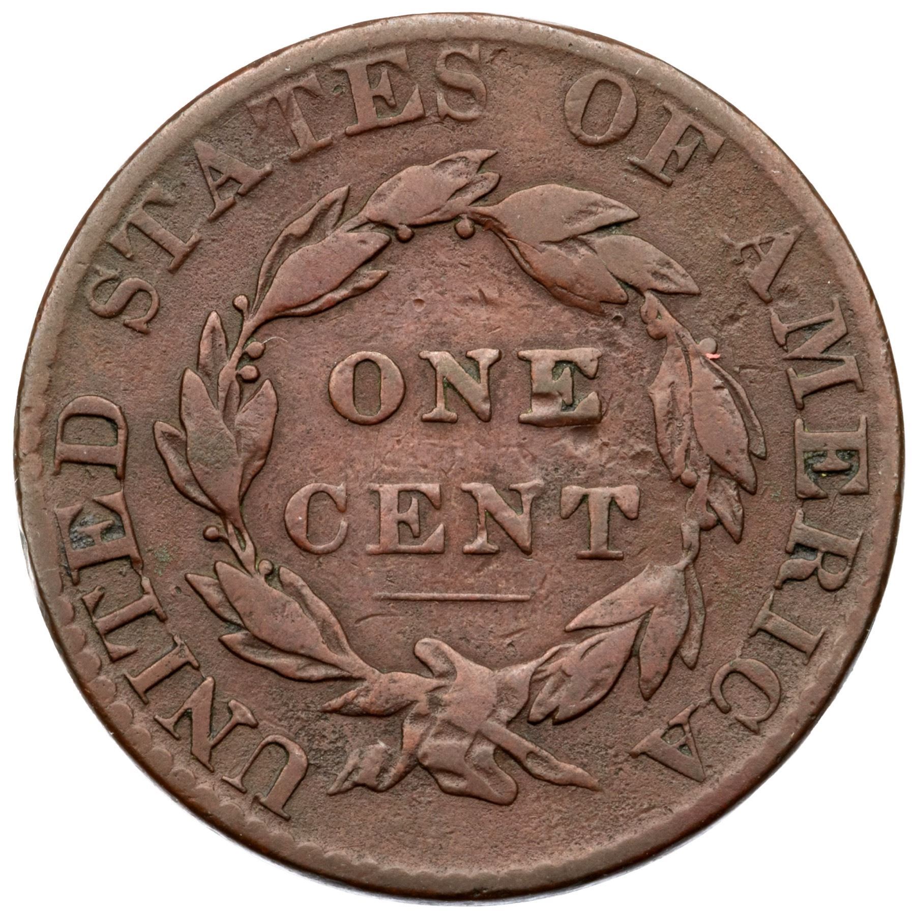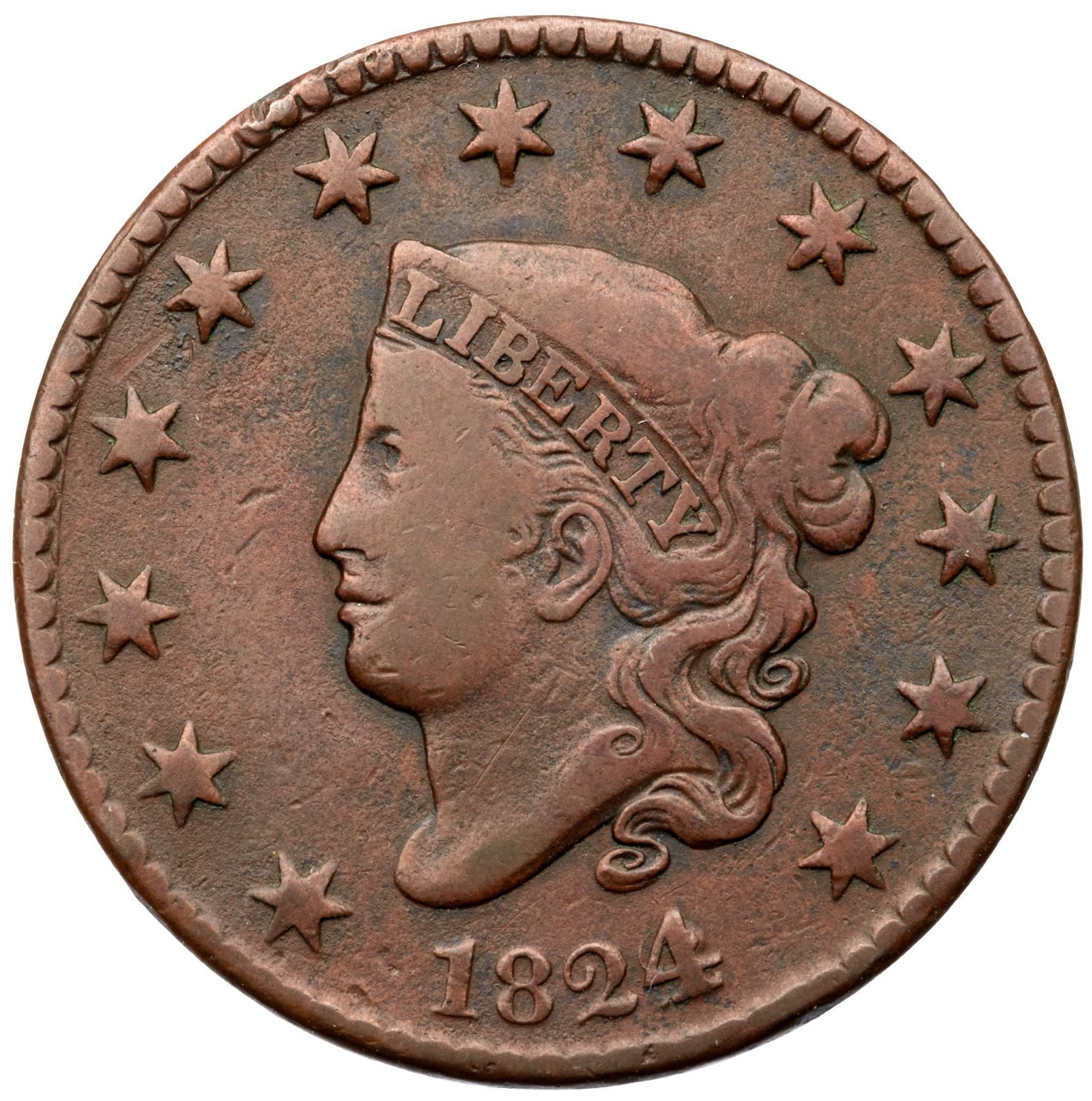 Glossy brown and chocolate blending to olive brown in a few protected places on the obverse. The surfaces are smooth and the only notable marks are a rim nick at star 6 and a minor rim bruise at the E in UNITED. MDS. The overdate feature is clear.