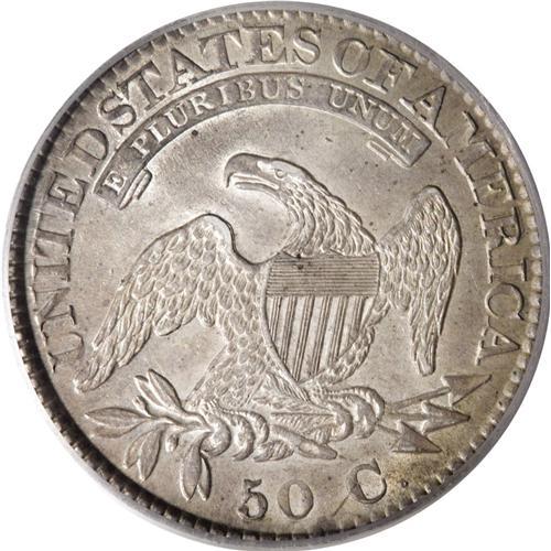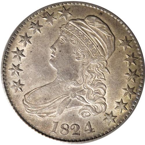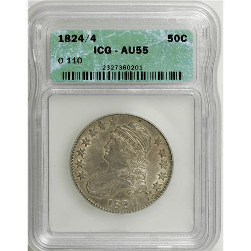 <B>1824/4 50C AU55 ICG.</B></I> O-110, R.2. The 4 is recut over a 4--although it is easily and often confused for a 1--and on the reverse there is a die dot below the U of UNUM. The letters AME are solidly joined at their bases. The dove-gray surfaces still show much luster and a tinge of pinkish-gold and ice-blue at the rims on each side. A nice coin for the grade.<BR><BR><b>Shipping:</b> Coins & Currency (<a target="_blank" href="http://www.heritageauctions.com/common/shipping.php">view shipping information</a>)