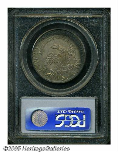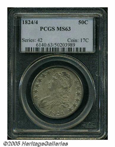 <B>1824/4<50C> MS63 PCGS.</B></I> O-110a, R.2. The variety is confirmed by the recut 4 in the date, the AME of AMERICA joined at the base, and a die crack through UNITED ST to edge above the A in STATES. Light rose-gray patination with ice-blue undertones embraces lustrous surfaces that are devoid of significant contact marks. The design elements are sharply struck, particularly in the centers. The star centers are weak. Population: 8 in 63, 1 finer (4/05).
