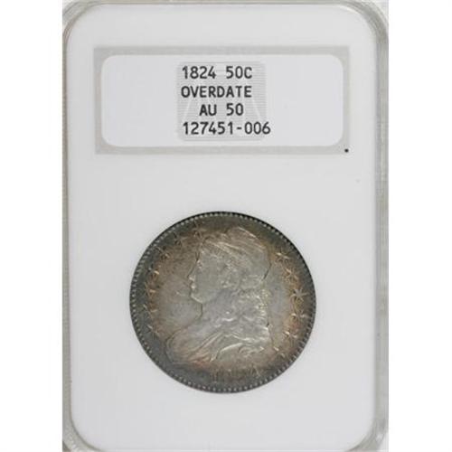 <B>1824/1 50C AU50 NGC.</B></I> O-101a, R.2. Powder-blue and golden-brown bands endow the margins of this unmarked and slightly subdued overdate Bust half. Certified in an older generation holder.<BR><BR><b>Shipping:</b> Coins & Currency (<a target="_blank" href="http://www.heritageauctions.com/common/shipping.php">view shipping information</a>)