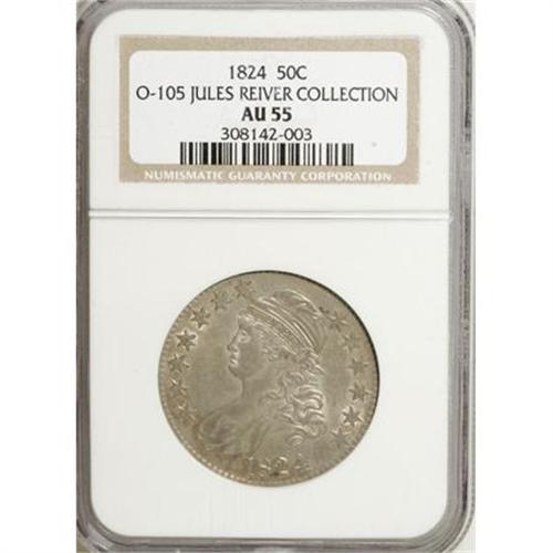 <B>1824 50C AU55 NGC.</B></I> O-105. Ex: Jules Reiver Collection. NGC Census: (79/3114). PCGS Population (91/239). Mintage: 3,504,954. Numismedia Wsl. Price for NGC/PCGS coin in AU55: $350. (#6137)<BR><BR><B>Coin Engraver:</B> John Reich<BR><BR><b>Shipping:</b> Coins & Currency (<a target="_blank" href="http://www.heritageauctions.com/common/shipping.php">view shipping information</a>)