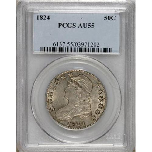 <B>1824 50C AU55 PCGS.</B></I> PCGS Population (91/239). NGC Census: (79/2513). Mintage: 3,504,954. Numismedia Wsl. Price for NGC/PCGS coin in AU55: $350. (#6137)<BR><BR><B>Coin Engraver:</B> John Reich<BR><BR><b>Shipping:</b> Coins & Currency (<a target="_blank" href="http://www.heritageauctions.com/common/shipping.php">view shipping information</a>)