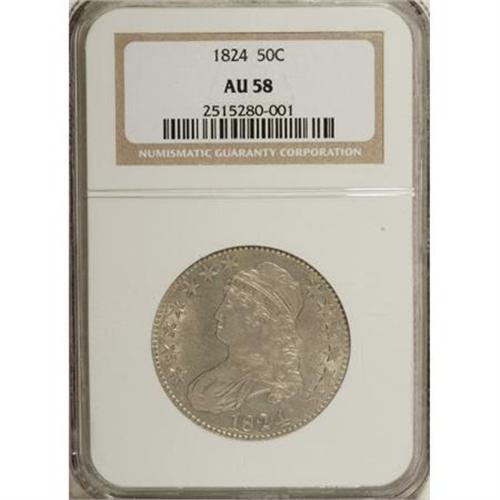 <B>1824 50C AU58 NGC.</B></I> NGC Census: (154/191). PCGS Population (89/150). Mintage: 3,504,954. Numismedia Wsl. Price for NGC/PCGS coin in AU58: $575. (#6137)<BR><BR><b>Shipping:</b> Coins & Currency (<a target="_blank" href="http://www.heritageauctions.com/common/shipping.php">view shipping information</a>)