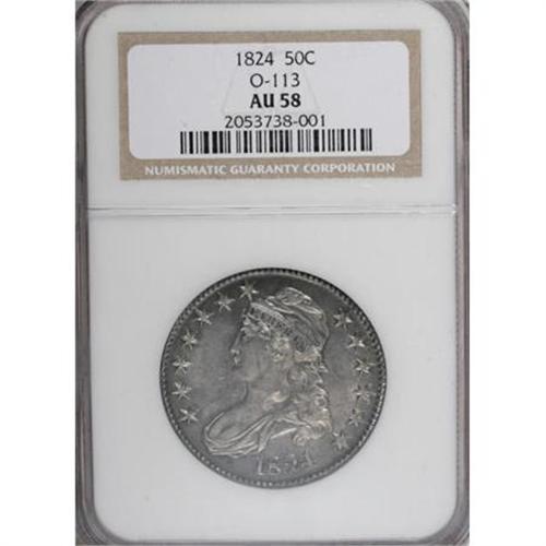 <B>1824 50C AU58 NGC.</B></I> O-113. NGC Census: (161/4275). PCGS Population (96/150). Mintage: 3,504,954. Numismedia Wsl. Price for NGC/PCGS coin in AU58: $600. (#6137)<BR><BR><B>Coin Engraver:</B> John Reich<BR><BR><b>Shipping:</b> Coins & Currency (<a target="_blank" href="http://www.heritageauctions.com/common/shipping.php">view shipping information</a>)