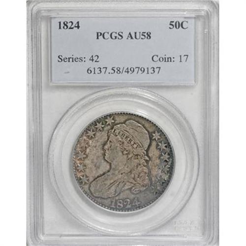 <B>1824 50C AU58 PCGS.</B></I> O-108, R.2. Rich cream-gray and cobalt-blue alternate across this satiny and unmarked representative. The RI in PLURIBUS is softly brought up, but the overall strike is good.<BR><BR><b>Shipping:</b> Coins & Currency (<a target="_blank" href="http://www.heritageauctions.com/common/shipping.php">view shipping information</a>)