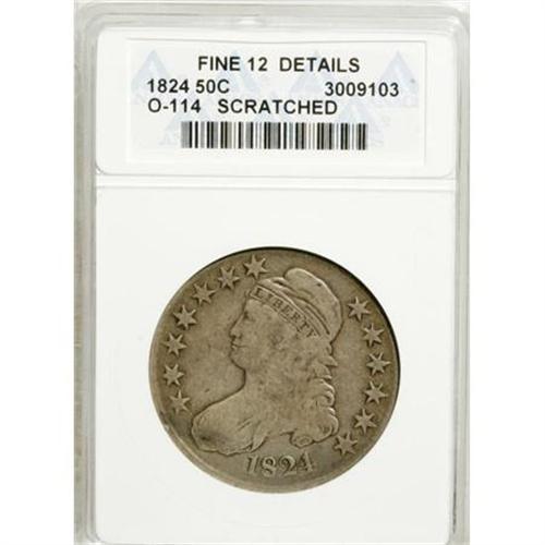 <B>1824 50C --Scratched--ANACS. Fine 12 Details.</B></I> O-114. NGC Census: (2/4057). PCGS Population (4/607). Mintage: 3,504,954. Numismedia Wsl. Price for NGC/PCGS coin in F12: $40. (#6137)<BR><BR><B>Coin Engraver:</B> John Reich<BR><BR><b>Shipping:</b> Coins & Currency (<a target="_blank" href="http://www.heritageauctions.com/common/shipping.php">view shipping information</a>)