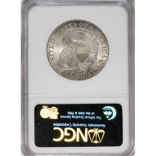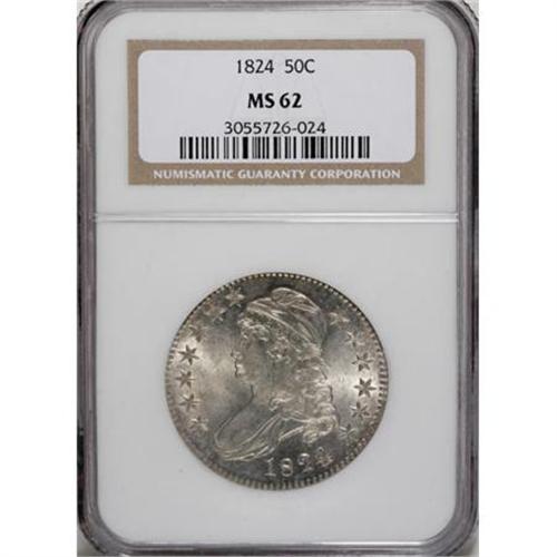 <B>1824 50C Overdate MS62 NGC.</B></I> O-103, R.1. Potent luster sweeps this beautifully smooth and lightly toned example. The major devices are intricately struck, and only the upper left stars show centril incompleteness. Overton called this dramatic overdate variety "a jumble of recuttings," while the <I>Guide Book</B></I> simply lists it as "4/Various Dates." Census: 8 in 62, 18 finer (8/07).<BR><BR><B>Coin Engraver:</B> John Reich<BR><BR><b>Shipping:</b> Coins & Currency (<a target="_blank" href="http://www.heritageauctions.com/common/shipping.php">view shipping information</a>)