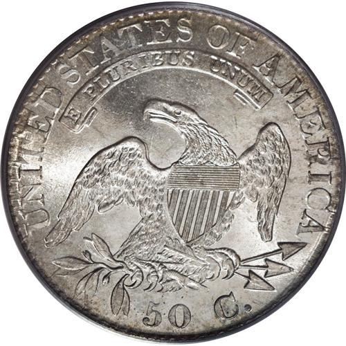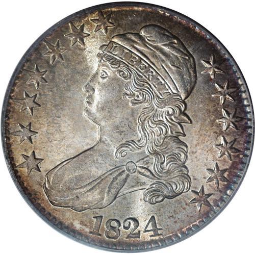 <B>1824 50C MS64 PCGS.</B></I> O-108a, R.2. A golden-brown and pearl-gray near-Gem with booming luster and well preserved fields. Well struck except for the left-side stars. A solitary mark on the cap provides a pedigree reference. Liberty's profile is widely strike doubled. An exquisite example of the type.<BR><BR><b>Shipping:</b> Coins & Currency (<a target="_blank" href="http://www.heritageauctions.com/common/shipping.php">view shipping information</a>)