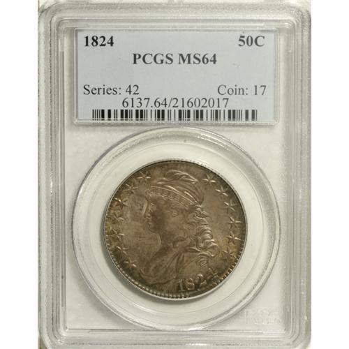 <B>1824 50C MS64 PCGS.</B></I> O-115, R.2. A tiny mint-made dot in the field below the left end of the scroll affirms the variety. Slight double profile on Liberty's nose. Well defined in virtually all areas beneath milky steel-violet and apricot-gold toning. Although a plentiful variety, Gem quality pieces are rarities, and near-Gem pieces such as this coin are elusive.<BR><I>From our February 2005 Long Beach Sale, lot 6989.</B></I><BR><I>From The Rocky Top Collection of Bust Half Dollars.</B></I><BR><BR><b>Shipping:</b> Coin/Currency (<a target="_blank" href="http://www.heritageauctions.com/common/shipping.php">view shipping information</a>)