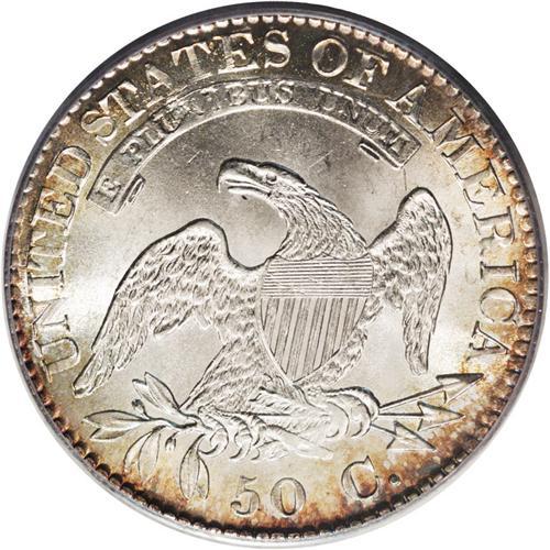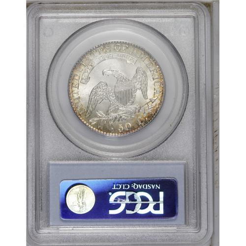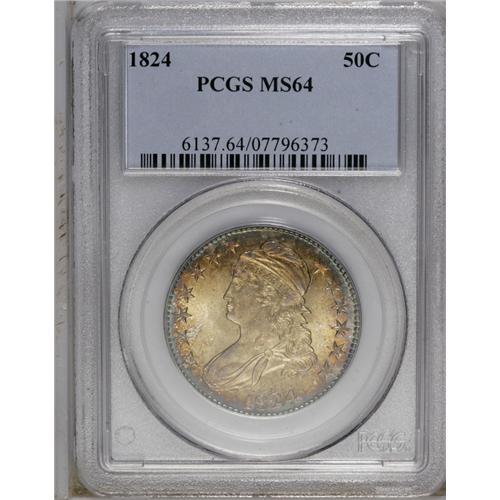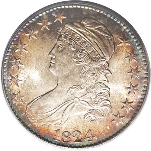 <B>1824<50C> MS64 PCGS.</B></I> O-108, R.2. Attributed by the proximity of obverse star 7 to the milling. Well struck and intensely lustrous, with a lavish coating of beautiful, original toning over the obverse that includes shades of golden-brown, cobalt-blue, and magenta. The reverse is bright and untoned in the center, with a slight band of pleasing peripheral coloration. A rough mark over the UR in PLURIBUS appears to be of mint origin, and no distracting post-strike abrasions are evident on either side of the coin. A lovely and technically impressive near-Gem example of this Overton variety.