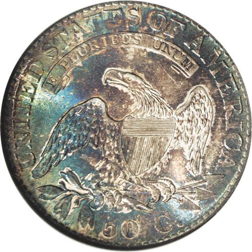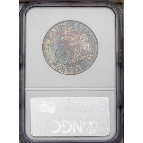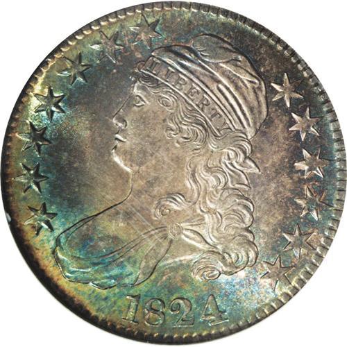 <B>1824<50C> MS66 NGC.</B></I> O-105, R.2. Few finer examples of this date have been certified. In fact, NGC has only seen two coins that they described better. It is a gorgeous Premium Gem example with fully lustrous surfaces beneath lovely russet, golden-brown, blue-green, and pale amber toning across both surfaces. This is probably the finest example of the variety to appear in auction, and it was this same coin that appeared in the October 2004 Rarities Sale held by Bowers and Merena. In fact, it is possible that this example is the single finest known of the O-105 die pairing. It is a sharply struck example from perfect dies exhibiting only light clash marks. There is no evidence of die cracks or other defects. The numismatic connoisseur will appreciate the exceptional aesthetic appeal of this Premium Gem example.