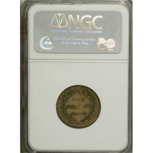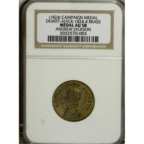 <B>(1824) Andrew Jackson Brass Political Medal, AU58 NGC.</B></I> DeWitt-AJack-1824-4. Brass, 24 mm. This is a choice example from the election of 1824 and about as nice as they come, with most of the original luster remaining. The reverse has a slight weakness in the center of the medal; otherwise, it is fully struck. <BR><BR><b>Shipping:</b> Coins & Currency (<a target="_blank" href="http://www.heritageauctions.com/common/shipping.php">view shipping information</a>)