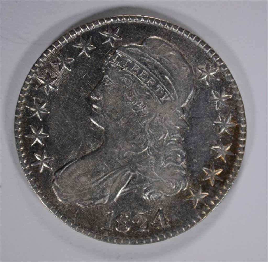 STRIKE 1824 BUST HALF DOLLAR, AU -LOTS OF LUSTRE, WEAK STRIKE