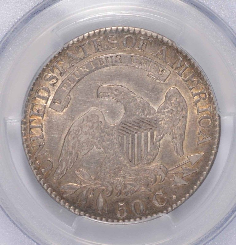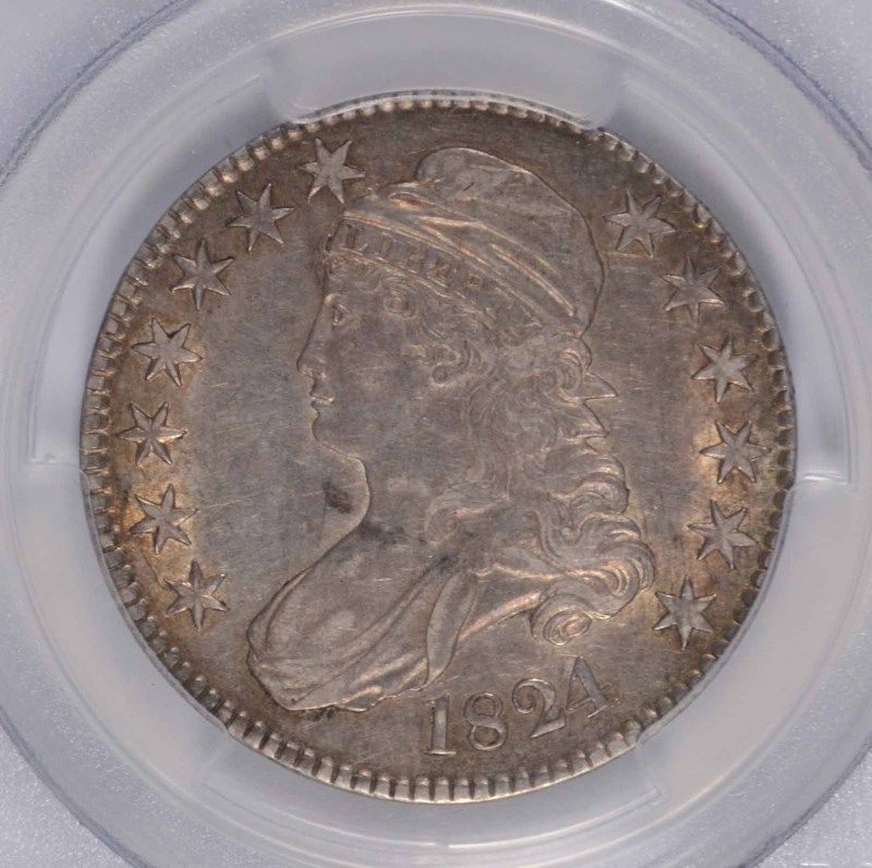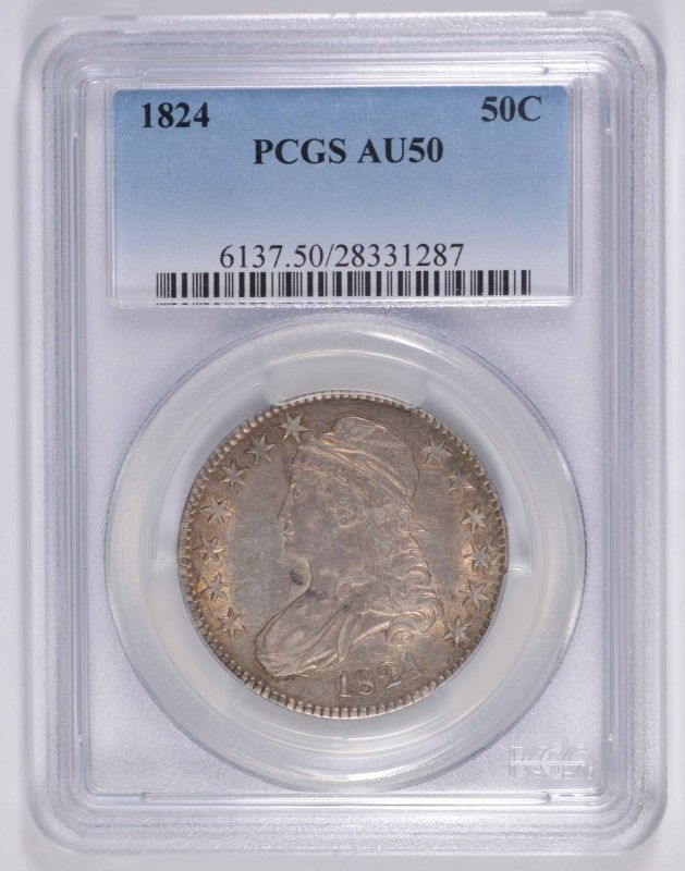 1824 BUST HALF DOLLAR, PCGS AU-50 RARE AND BEAUTIFUL COIN