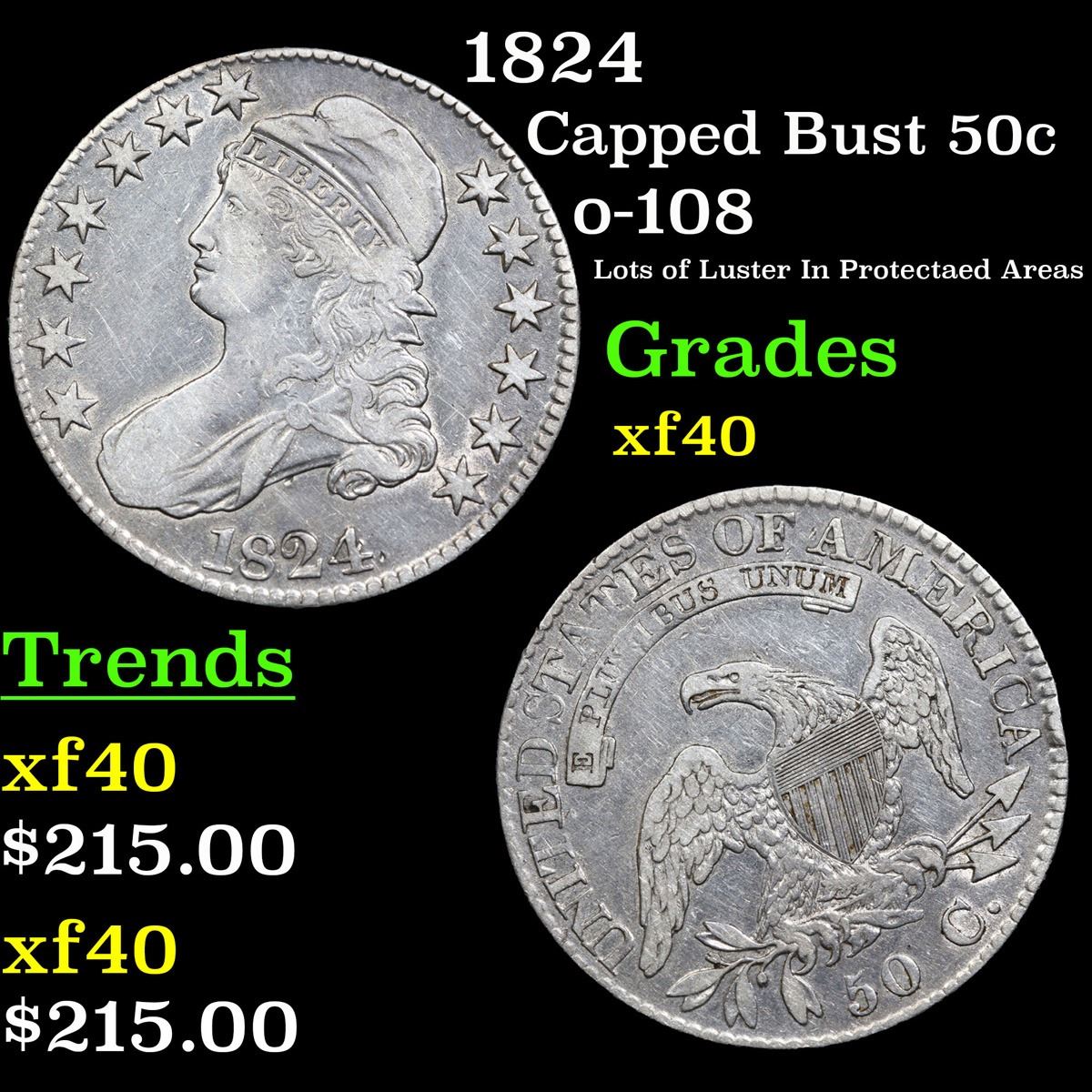 1824 o-108 Lots of Luster In Protectaed Areas Capped Bust Half Dollar 50c Grades xf.