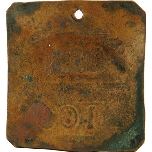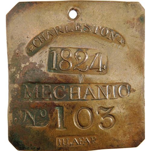 <B>1824 Charleston MECHANIC Slave Hire Badge. Number 103.</B></I> A slightly convex square-shaped tag with clipped corners, a hole for suspension, 49mm x 53mm. An uncommon "J.J. LAFAR" hallmark is on the front at the bottom. Typically, the LaFar hallmark does not include the initials on 1824 examples. The elements on the front are as follows (top to bottom): "*CHARLESTON*" in a crescent-shaped bar punch (slightly double struck); "1824" bar punched; "MECHANIC" in a rectangular punch; "No" in a square punch followed by an incuse "103" in individual punches; and, as mentioned, "J.J. LAFAR" in a rectangular punch. This example was certainly not dug and as Rich Hartzog of World Exonumia describes it: "While difficult to see, there is a small burr at the top of the hole, attesting to it never being used!" This is as nice a slave badge as you're likely to find with extremely fine detail and a smooth surface. <BR><BR>If you are looking for a slave tag based on displayability, this is definitely one to consider. The scarceness of the Mechanic occupation coupled with the unusual hallmark variation on the front and excellent condition makes this an extremely desirable example.