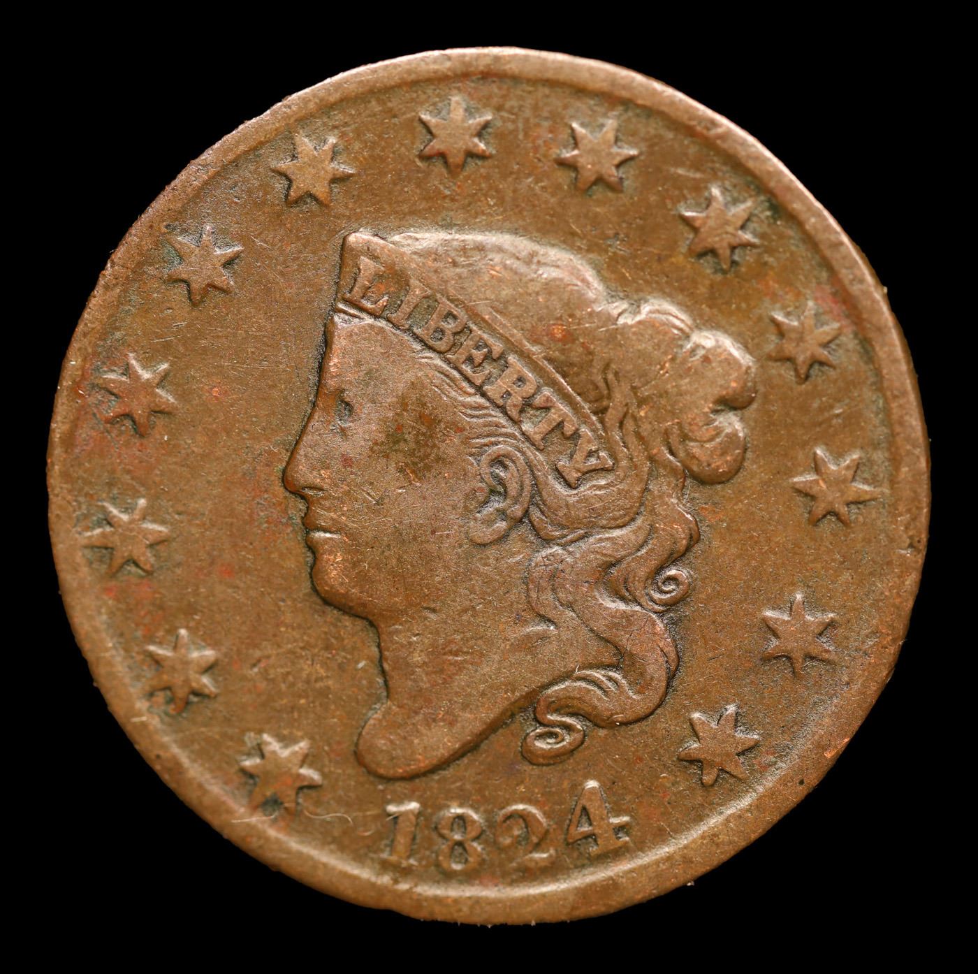 1824 Coronet Head Large Cent 1c Grades vf+.