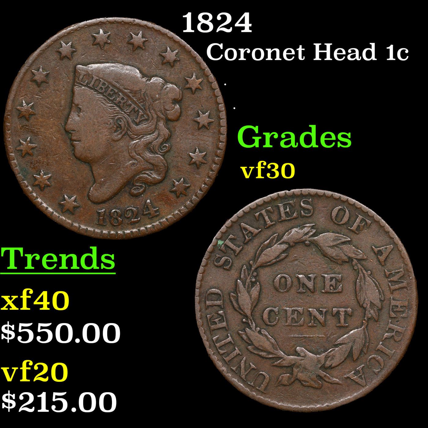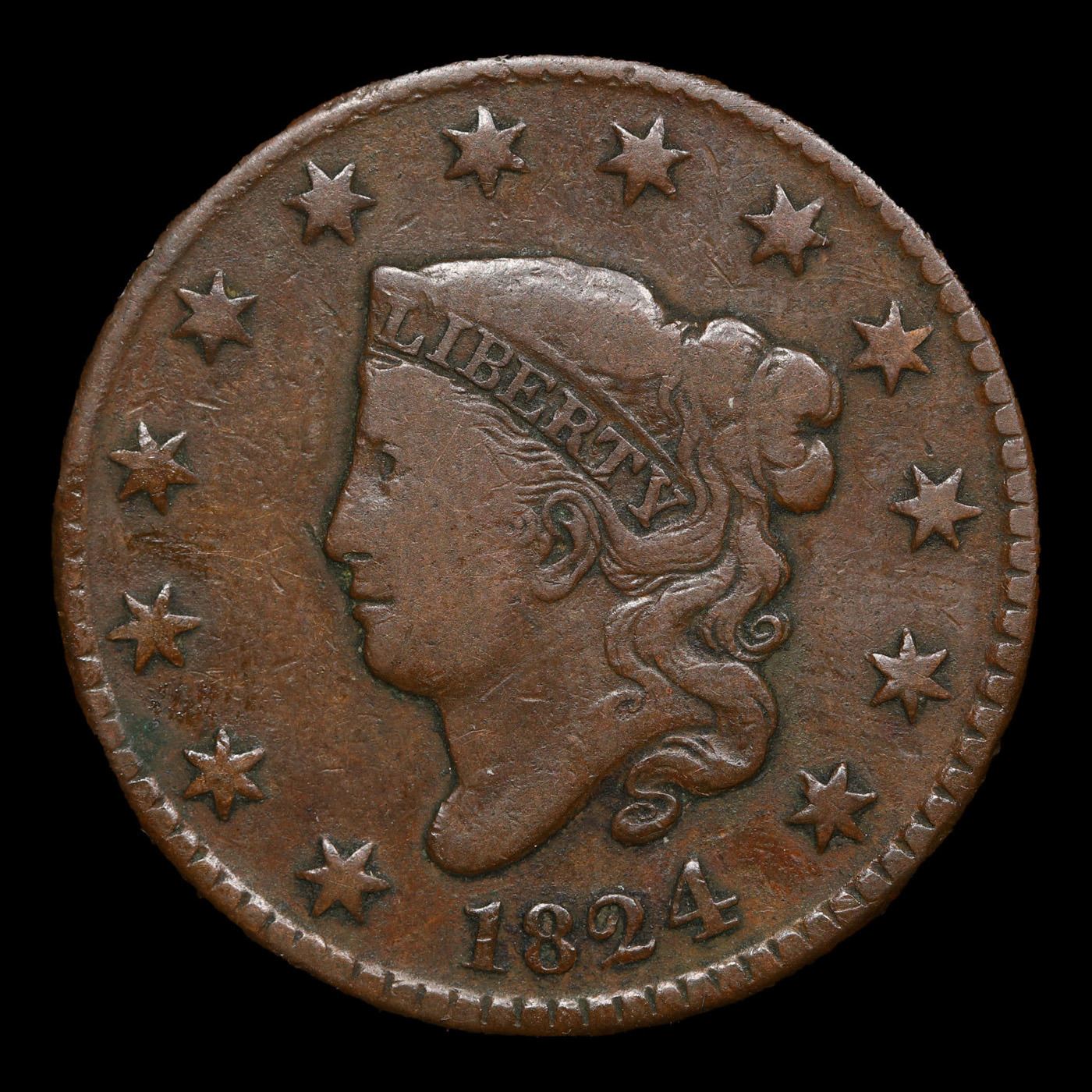 1824 Coronet Head Large Cent 1c Grades vf++.