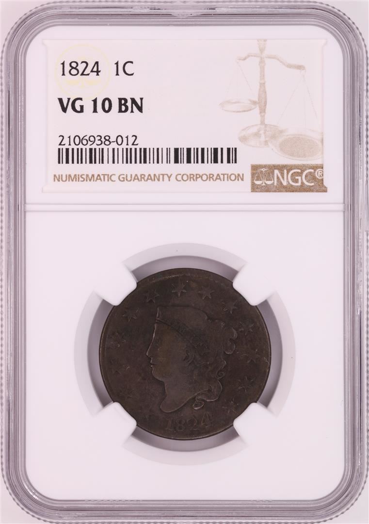 One 1824 Coronet Head Large Cent Coin NGC VG10BN. NGC Certified.