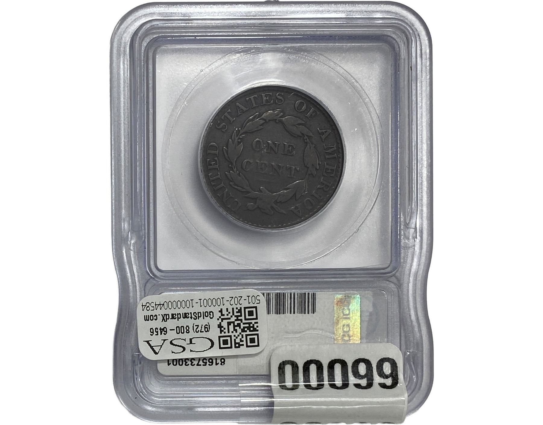 l. All non-certified coins and currency are guaranteed genuine, but are not guaranteed as to grade, since grading is a matter of opinion, an art and not a science, and therefore the description rendered by GSA or any third-party grading service may not agree with the opinion of others (including trained experts), and the same expert may not grade the same item with the same grade at two different times. GSA may, but is not obligated to, express an opinion as to non-certified numismatic items, in GSA’s opinion, or by its employees’ experience and the current interpretation of the American Numismatic Association’s standards as of the date the catalog was prepared. There is no guarantee or warranty expressed or implied that the grading opinions utilized by GSA, if any, will meet the standards of any grading service at any time in the future.