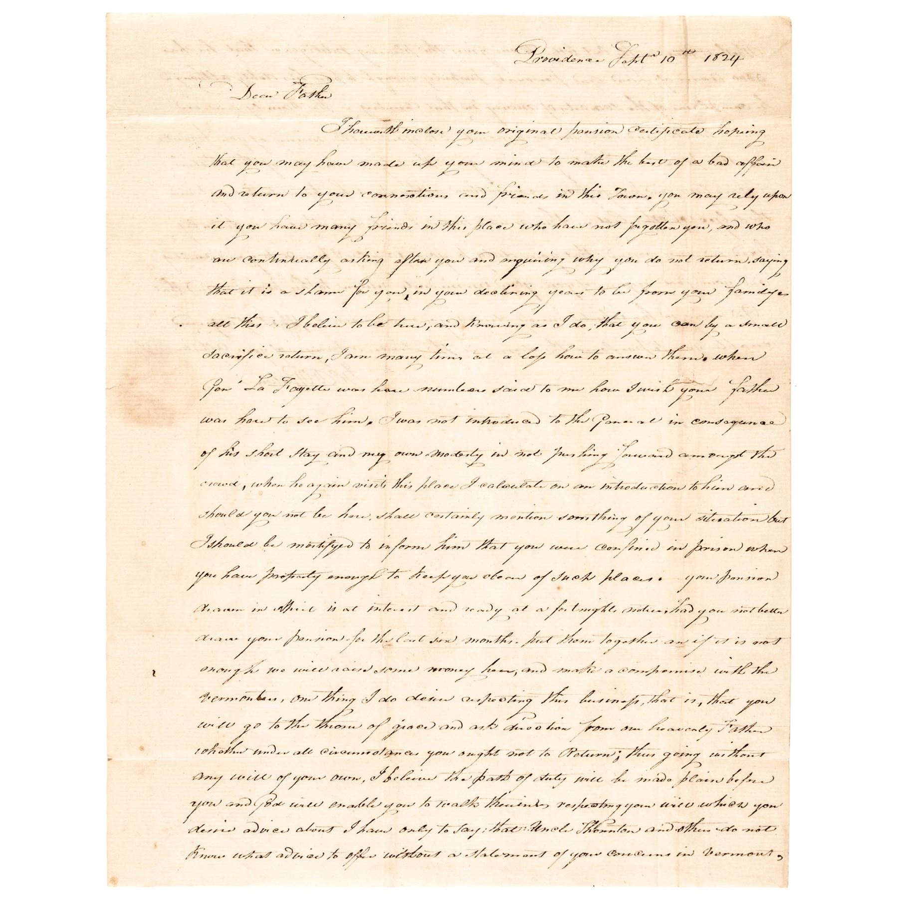 September 10, 1824-Dated, Important Autograph Letter Signed, “Jno B. Barton,” (John Barton, the Son of Revolutionary War General William Barton), Providence, Rhode Island, Choice Very Fine. This original Handwritten Letter is dated September 10, 1824, at the time General Marquis de Lafayette was on his historic return tour of America from France. This Letter has 1.5 pages on one sheet front & back. It is nicely written in rich brown on fine quality watermarked laid period paper with one trivial internal fold split, overall measuring 7.75” x 10”. John Barton has written his father, the famous American Revolutionary War General William Barton, regarding the arrival of the General’s Pension Certificate, and also mentions his attempt at meeting with General Lafayette during a recent visit.