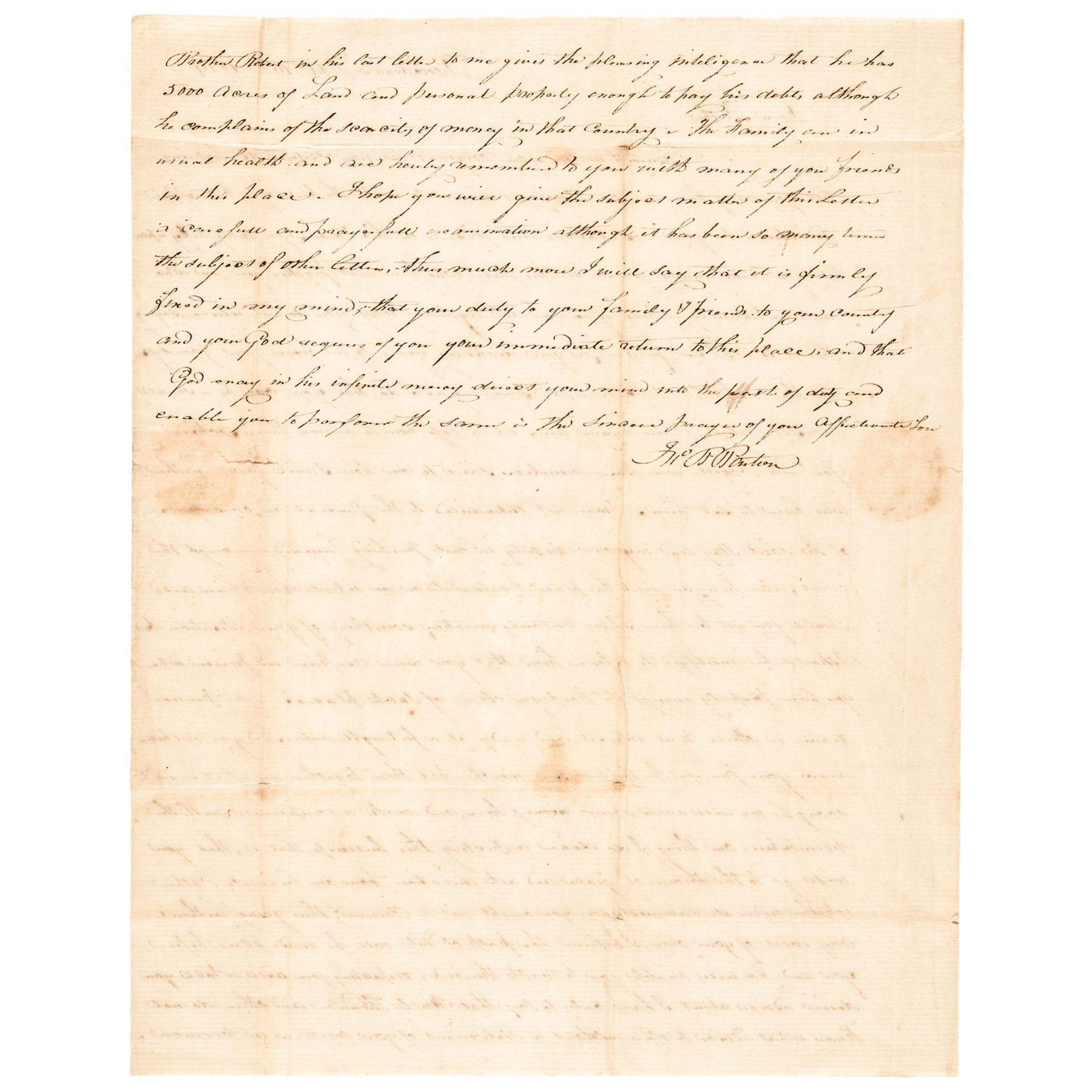 Brother Robert in his last letter to me gives the following inteligence that he has 5000 Acres of Land and personal property to pay his debt, although he complains of the scarcity of money in the Country. The Family is in usual health and are sending rememberance to you with many of your friendsin this place. I hope you will give the subject matter of this Letter a careful and ( - ) consideration. Although it has been so many times the subject of other Letters. Thus much more I will say that is firmely Fixed in my mind; that your duty to your Family & Friends, to your Country and your God requires of you your immediate return to this place. And that God may in his infinite mercy direct your mind into the Service of duty and enable you to perform the same as the Sincere Prayers of your Affectionate Son. -- (Signed) Jno B. Barton”.