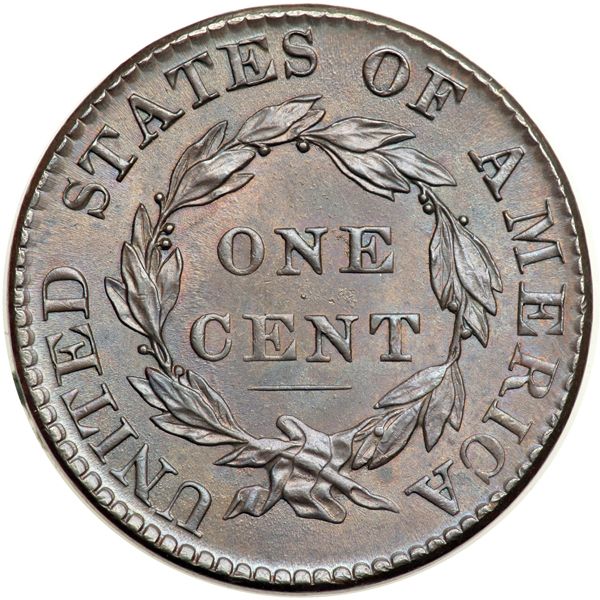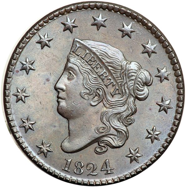 1824 N-2 R2 MS63. Lustrous bluish steel and chocolate with hints of very faded mint color in a few of the protected areas on the reverse. Satiny and virtually flawless except for a small spot of very fine carbon in the field off the end of the nose. Sharply struck MDS with the usual fine die rust on both sides. The die rust is most evident in a small patch on the neck under the ear lobe and in the field around NE in ONE. A premium example. Called MS63 and tied for CC#3 in the Noyes census, his photo #56020. Removed from a PCGS slab graded MS64BN (PCGS label included).