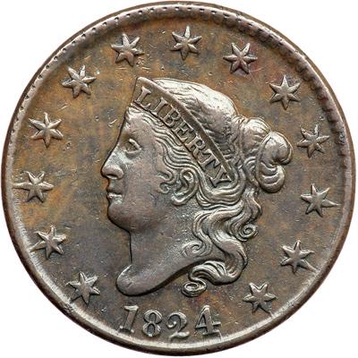 1824 N-2 R2. VF-30. Glossy light chocolate and olive brown with frosty flowline luster in protected areas. Smooth surfaces, only a few light contact marks, including a small rim bruise at the first T in STATES. M-LDS with flowlines connecting the bottom of the date to the rim below.