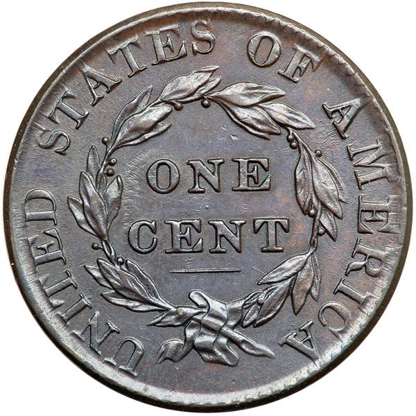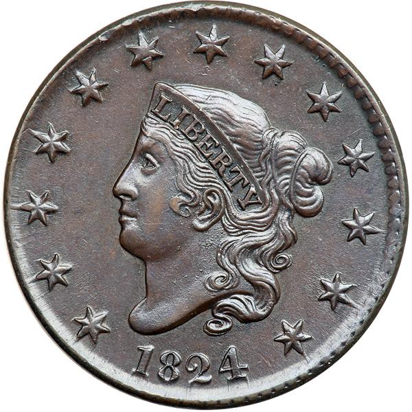 1824 N-2 R2. PCGS graded AU-58. Very attractive glossy chocolate brown with mint frost remaining in protected areas, especially on the reverse. A trio of tiny, dull rim nicks at stars 6-7 are the only marks. M-LDS with fine die rust lumps at the ear and neck below, and crumbling in the left notch of N in CENT. At least half the dentils on both sides are still visible, although they are weak, and the reverse is not rotated. Noyes photo #29554. Our grade is AU50. Pop 1; 1 finer in MS64. Only 2 graded at PCGS for the variety. DWH #3180 (PCGS # 36769) .