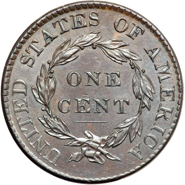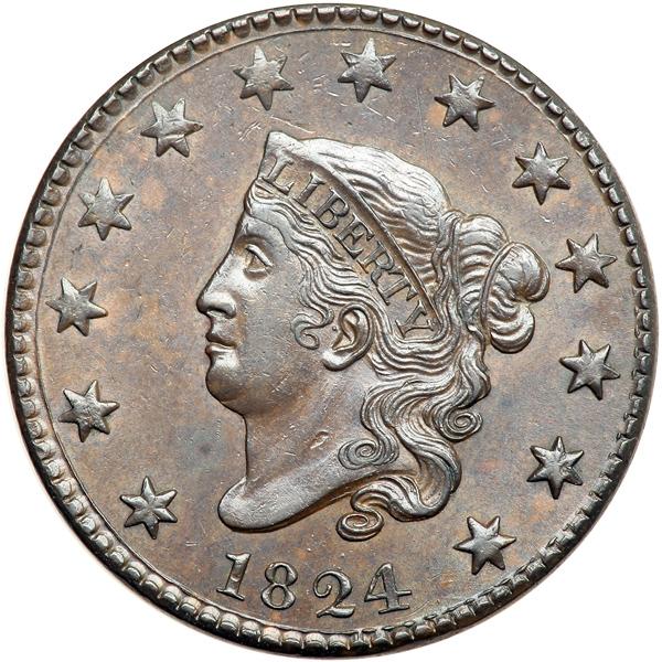 1824 N-3 R2. PCGS graded MS-62 Brown. Lustrous bluish steel brown and chocolate, the obverse delicately mottled with some darker olive brown tones. The fields and protected areas are covered with satiny mint frost and the eye appeal is excellent. The notable marks are a light diagonal nick in the center of the neck, a faint diagonal hairline under star 8, a faint spot of microscopic roughness in the field under the chin, and a few tiny pinpricks at the left base of the N in CENT. EDS with a sharp inner circle around most of the obverse. Nicely struck except for some minor weakness on the tip of the coronet. The reverse is slightly misaligned to K-5.5 while the obverse is nearly centered on the planchet. Noyes photo #58222. Our grade is AU55. Pop 1. The only Brown example graded at PCGS. DWH #2511 (PCGS # 36772) .