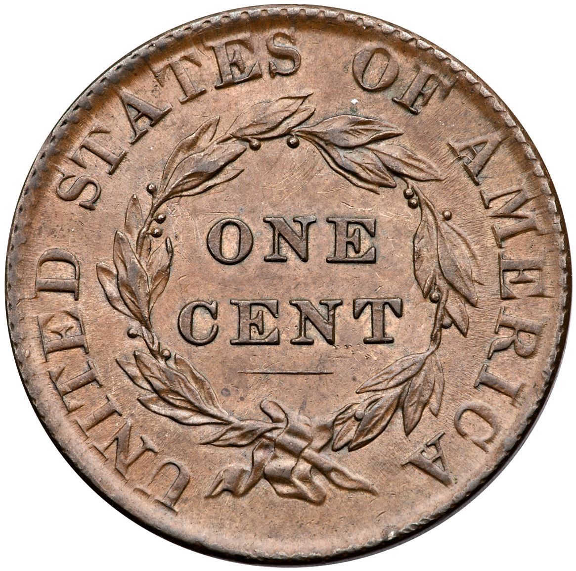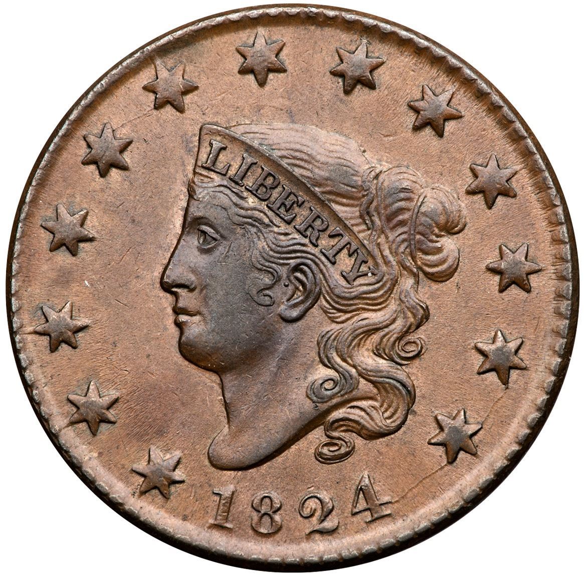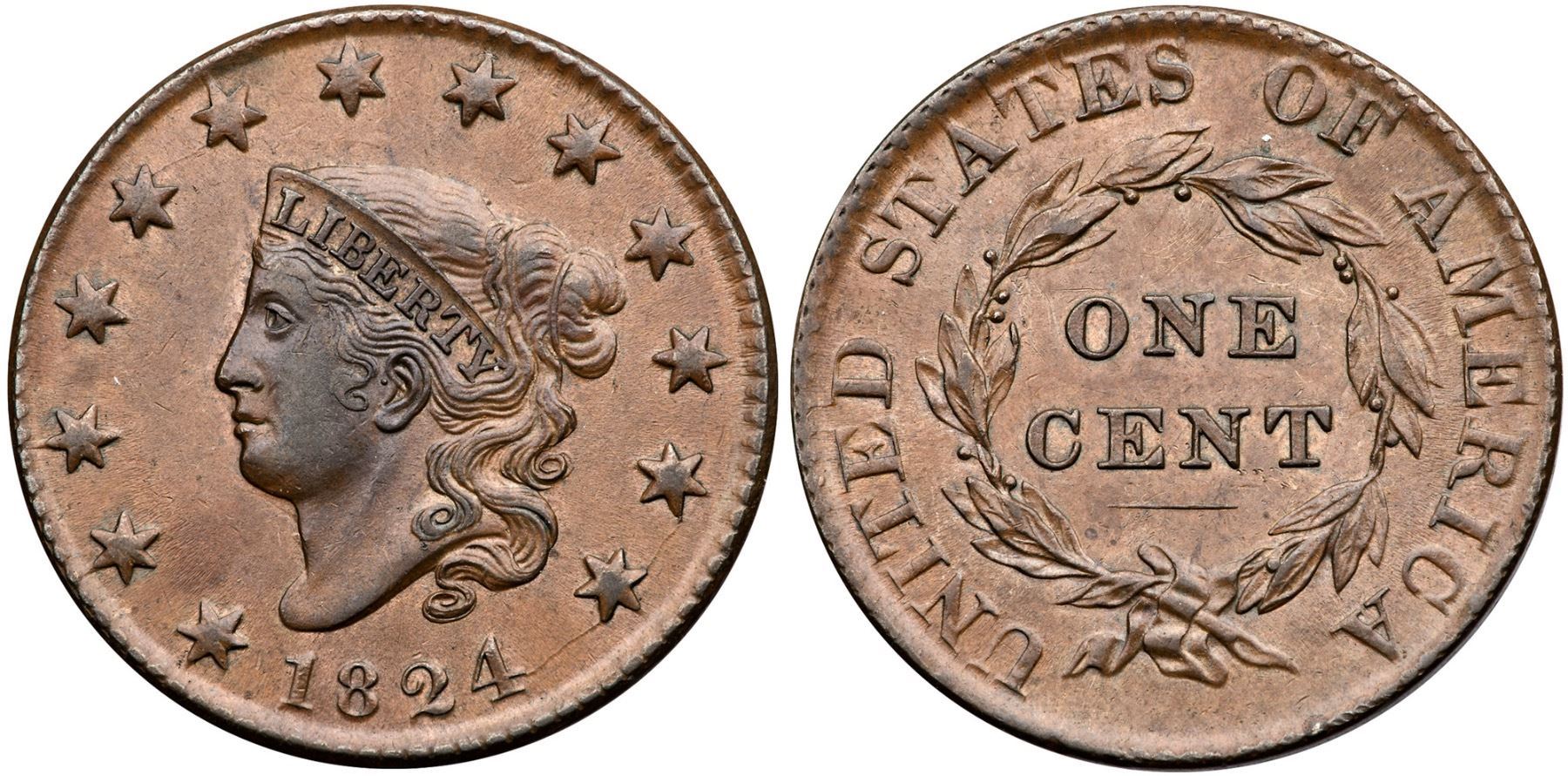 1824 N-4 R-2 EF45Attractive golden brown and light olive with slightly darker brown on some high points. There are some wispy pin scratches above ONE that blend in well, the only notable marks. Satiny, lustrous surfaces. LDS, with fine die breaks from 4 to the right through stars 11-13, and another connecting stars 5-6.Certificate Number: Pedigree: Ex; Philip Van Cleave Kagins 2/1986:5444 - Wes Rasmussen Collection HA 1/2005 - Dennis Fuoss