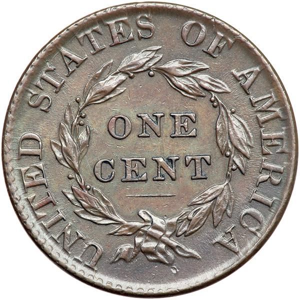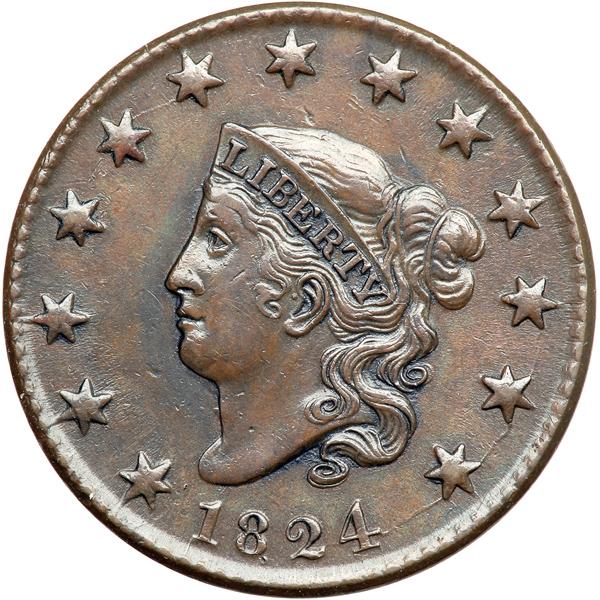 1824 N-4 R2 EF40. EF-40. Glossy chocolate and steel brown, possibly retoned but the eye appeal is excellent. No spots or roughness, the only defect being a tiny nick under the ribbon loop below the wreath. LDS. The obverse die cracks that connect star 5 to star 6 and the 24 to stars 13-11 are clear, but the inner circle off the dentil tips on the left side of the obverse is gone. DWH #0580.