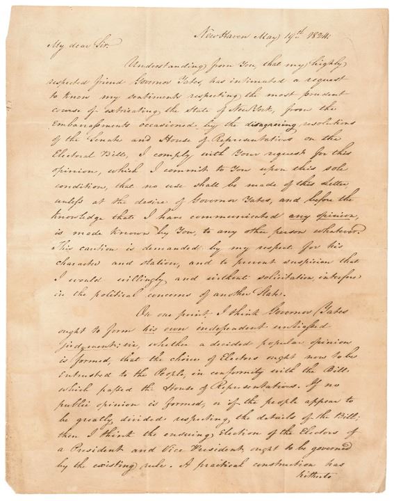 “My dear Sir, - Understanding from you, that my highly respected friend Governor Yates, has intimated a request to know my sentiments respecting the most prudent course of extricating the State of New York, fromthe embarrassments occasioned by the disagreeing resolutions of the Senate and House of Representatives on the Electoral Bills, I comply with your request for this opinion, which I comit to you upon this sole condition, that no use shall be made of this letter unlessat the desire of Governor Yates, and before the knowledge that I have communicated any opinion, is made known by you, to any other person whatever. This caution is demanded by my respect for his character and station, and to prevent suspicion that I wouls willingly and without solicitation, interfere in the political concerns of another State.