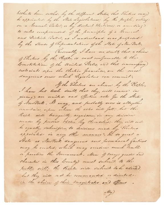 A practical construction has hitherto been settled by the different States, that Electors may be appointed by the State Legislatures; by the people, voting on a General Ticket, or by District Elections; or according to rules compounded of the priciples of a General and District Ballot, as I understand was proposed by the House of Representatives of the State of New York. Personally I have no doubt, that a choice of Electors, by the People, is most conforable to the Constitution of the United States, and the unnecessary restraints upon the Elective Franchise, are the most dangerous errors which Legislators can commit.