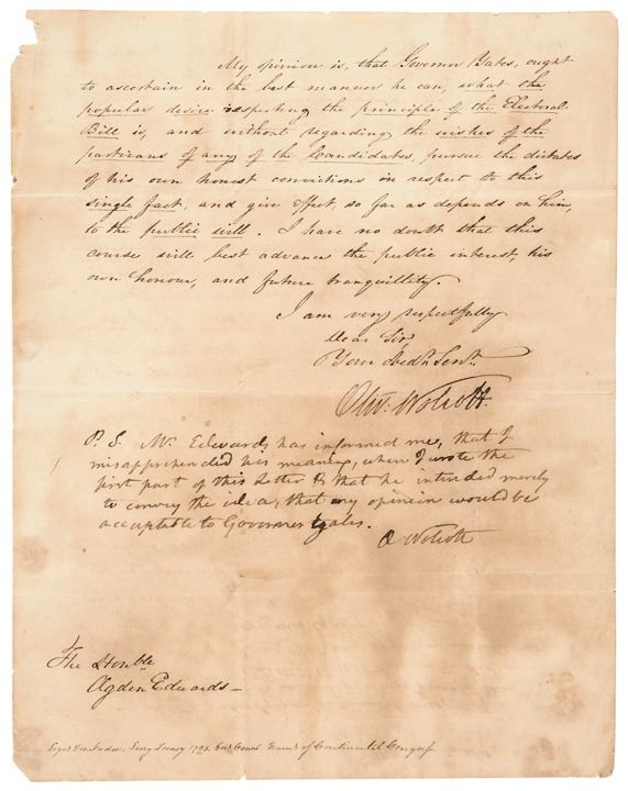 My opinion is, that Governor Yates, ought to ascertain in the best manner he can, what the popular desire respecting the principles of the Electoral Bill is, and without regarding the wishes of the partisans of any of the Candidates, pursue the dictates of his own honest convictions in respect to this single fact, and give effect, so far as depends on him, to the public will. I have no doubt that this course will best advance the public interest, his own honour, and future tranquillity. -- I am very respectfully - Dear Sir, - Your Obedt. Servt. - (Signed) Oliv. Wolcott.” Wolcott then adds, in full:
