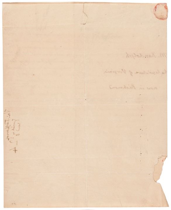 The existence of the two letters about which Jefferson speaks are apparently unknown, but a letter sent by Jefferson to Mr. A. Stewart, dated May 23, 1795, refers to books he had sent to Staunton. First listed among the books was the “Coke Littleton” mentioned in this letter. A fascinating letter of Jefferson’s own recommendation for the education of a young lawyer. Autograph address and franking signature, “free Th. Jefferson,” on the verso,
