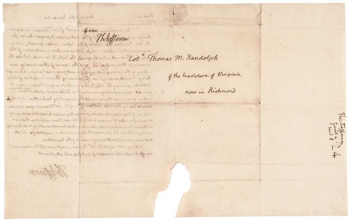 January 4, (18)24-Dated, Autograph Letter Signed Twice, “Th. Jefferson,” measuring 7.75” x 9.75” fully opened measuring to 9.75 x 15.5”, 1 page, from Monticello, with its Integral Free Franked Mailing Cover, providing a Second Signature, “free - Th. Jefferson,” Choice Extremely Fine. Written to Colonel Thomas M. Randolph, Jr., of the legislature of Virginia, now in Richmond.” Thomas Mann Randolph married Martha Jefferson, the oldest daughter of Thomas Jefferson and they had twelve children. In this Letter, Thomas Jefferson writes, in full: