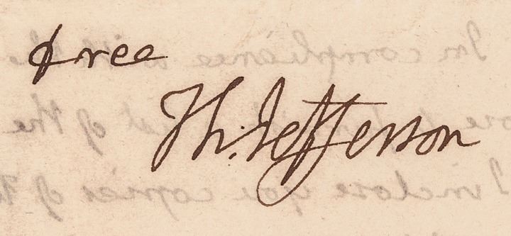 Integral Free Franked Mailing Cover, with Second Signature, “free - Th. Jefferson,” measuring 2” long and boldly written in deep rich brown. The 3.75” x 8.25” integral envelope portion was red wax sealed and torn, when originally opened. The irregularly shaped paper tear is lacking, measuring about 2.5” x 1.5” at bottom, between the two panes not anywhere near or affecting any of the written text. Docket noted at far right center in the recipient’s hand, “Th: Jefferson - Januy 4: 24 - recd (received) 8”. Round Red Postal Mailing Date Stamp upon the envelope panel at left. Overall, a museum quality, boldly written and presented Twice Signed Thomas Jefferson Autographed Letter worthy of the finest of Presidential autograph collections.
