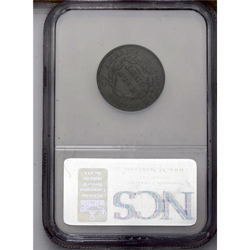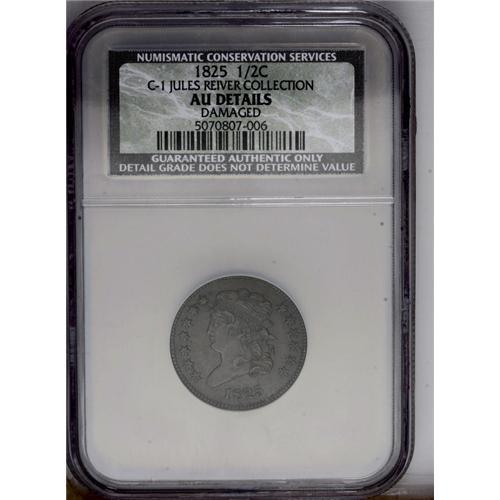 <B>1825<1/2 C> C-1, B-1, R.3. Die State 3--Damaged--NCS. AU Details. VF30 EAC.</B></I> Curl centered above 5; High leaf just beyond S. Slightly later die state than the other 1825 C-1 in this collection, and now with the obverse die crack slightly more prominent. Jules included this coin in his collection as an example of a severely rotated reverse. The reverse die is rotated approximately 120 degrees counterclockwise. Dark chocolate and steel color with minor verdigris on both sides and a small scrape above the D on the reverse. It is the latter that led NCS to label this as damage, but it does not seem all that serious to us. <BR><I>Ex: Dill (11/17/1970).</B></I> Envelope Included.