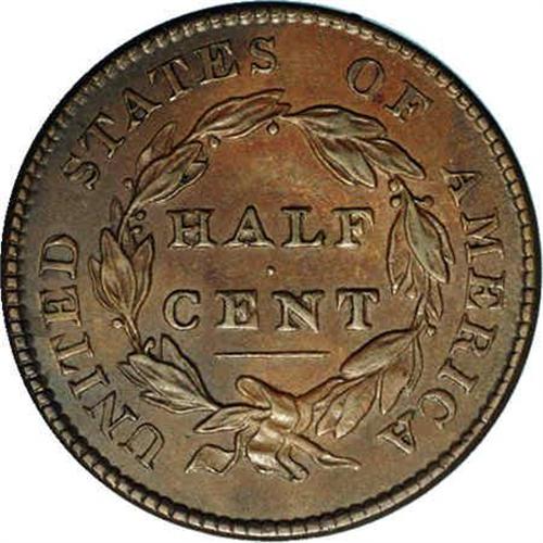 <B>1825<1/2 C> C-1, B-1, R.3. Die State 2--Environmental Damage--NCS. Unc Details. XF45 EAC.</B></I> Curl centered above 5; High leaf just beyond S. Both the obverse die crack and the oval shaped lump between the bases of F and A on the reverse are visible, though both of these die state characteristics are extremely hard to see. After an intermission of 13 years, the Half Cent denomination resumed in 1825 with a recorded mintage of 63,000 coins, just 140 coins shy of the coinage total reported for 1811. Like nearly all examples of this die combination, this has the reverse die rotated, in this case approximately 45 degrees clockwise. This is a lovely example with olive-tan coloration on both sides, the obverse with deep orange highlights (not mint color), and a small area of darker brown toning along the upper right border. The reverse has considerable maroon and steel color. An attractive example and decidedly elusive in higher grades. Breen Die State III.<BR><I>Ex: Bob Yuell (2/22/1999).</B></I> Envelope Included.