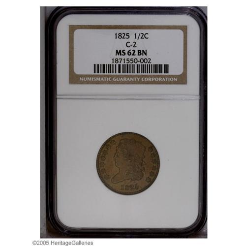 1825 1/2 C MS62 Brown NGC. B-2, C-2, R.1. Sharply stru 1825[1/2 C] MS62 Brown NGC.
