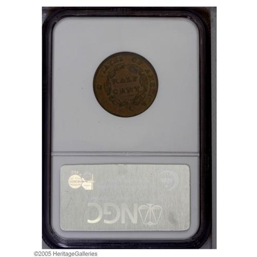 <B>1825<1/2 C> MS62 Brown NGC.</B></I> B-2, C-2, R.1. Sharply struck, save for a touch of softness in a couple of the star centers, in the leaves of the lower right wreath and on UNITED. The surfaces are a light to medium brown with some encrustation in the protected areas. A couple of tiny, obscure marks are noted on Liberty's cheek.
