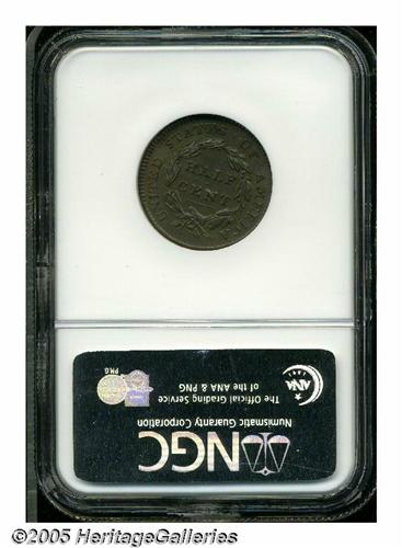 <B>1825<1/2 C>--Planchet Crack at 8 O'clock--MS63 Brown NGC.</B></I> B-2, C-2, R.1. Light rose color dominates the obverse, aside from an area of somewhat deeper and faintly granular surface on the lower right. The reverse displays pleasing olive and chocolate color. Sharply struck except for the upper left stars, this carefully preserved example is nearly unabraded.