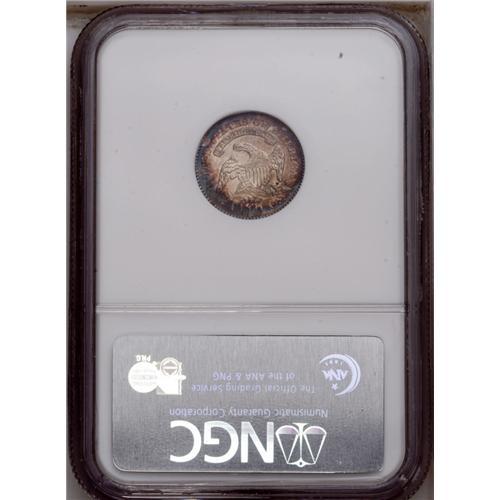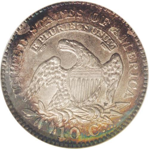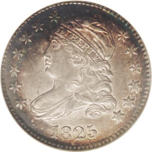 <B>1825<10C> MS63 NGC.</B></I> JR-4, R.2. Easily attributed by star 7 pointing to the top corner of the headband. Areas of dark-green, lavender, cobalt-blue, and brick-red patina occupy each side, and traces of luster are seen in the protected areas. The design elements are adequately defined, though some of the star centers and Liberty's hair curls are weak, as are the arrow feathers and the eagle's neck feathers. Well centered, with very clean surfaces for the assigned grade. Census: 12 in 63, 18 finer (1/06).